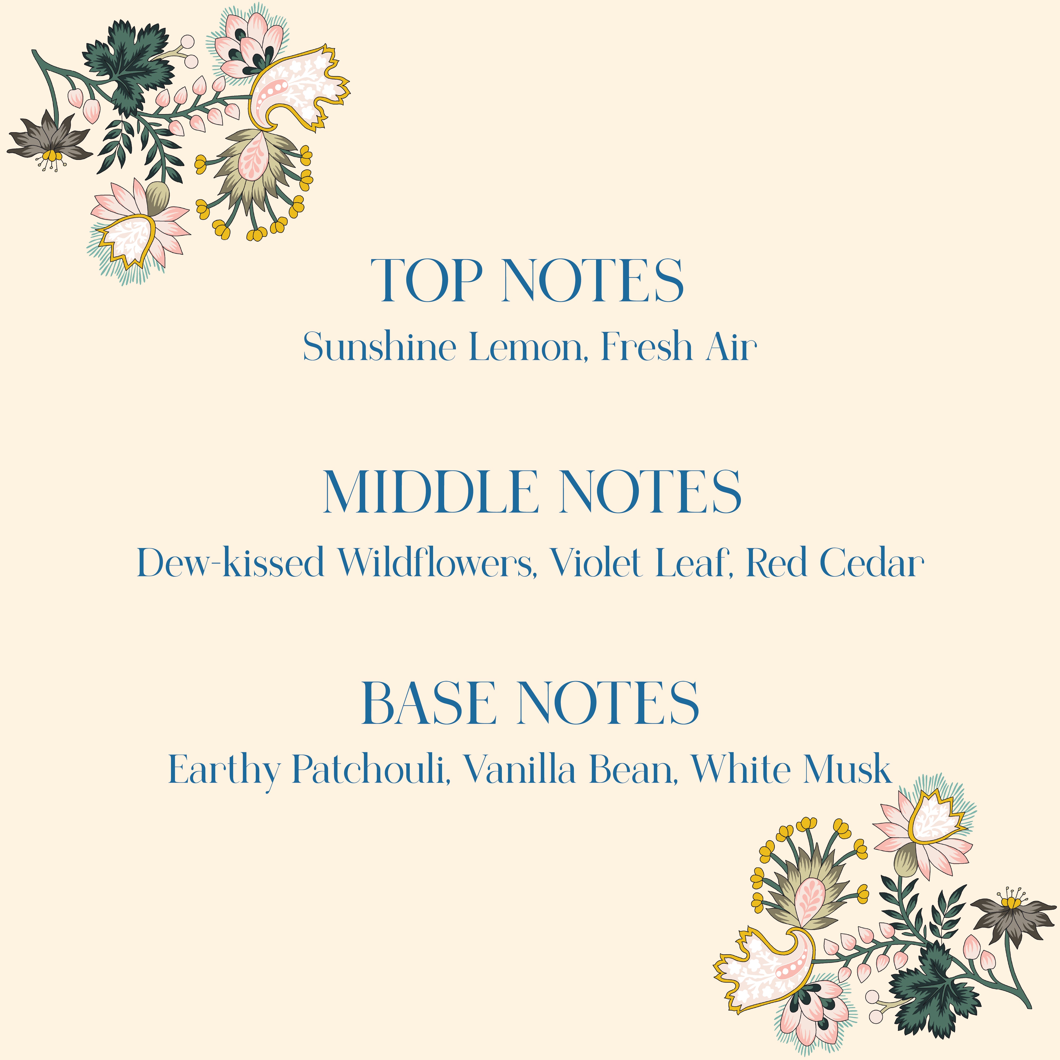 Scented like the prettiest sea of wildflowers swaying in the breeze on a warm day. Wildflower + Vanilla Cedar is earthy and grounded. The combination of patchouli, vanilla and musk set the base of the fragrance. And they're softened by simple notes of lemon, fresh air, tree bark, and delicate wildflowers.